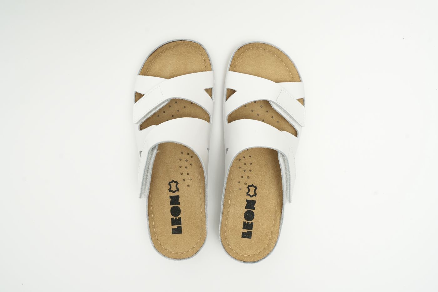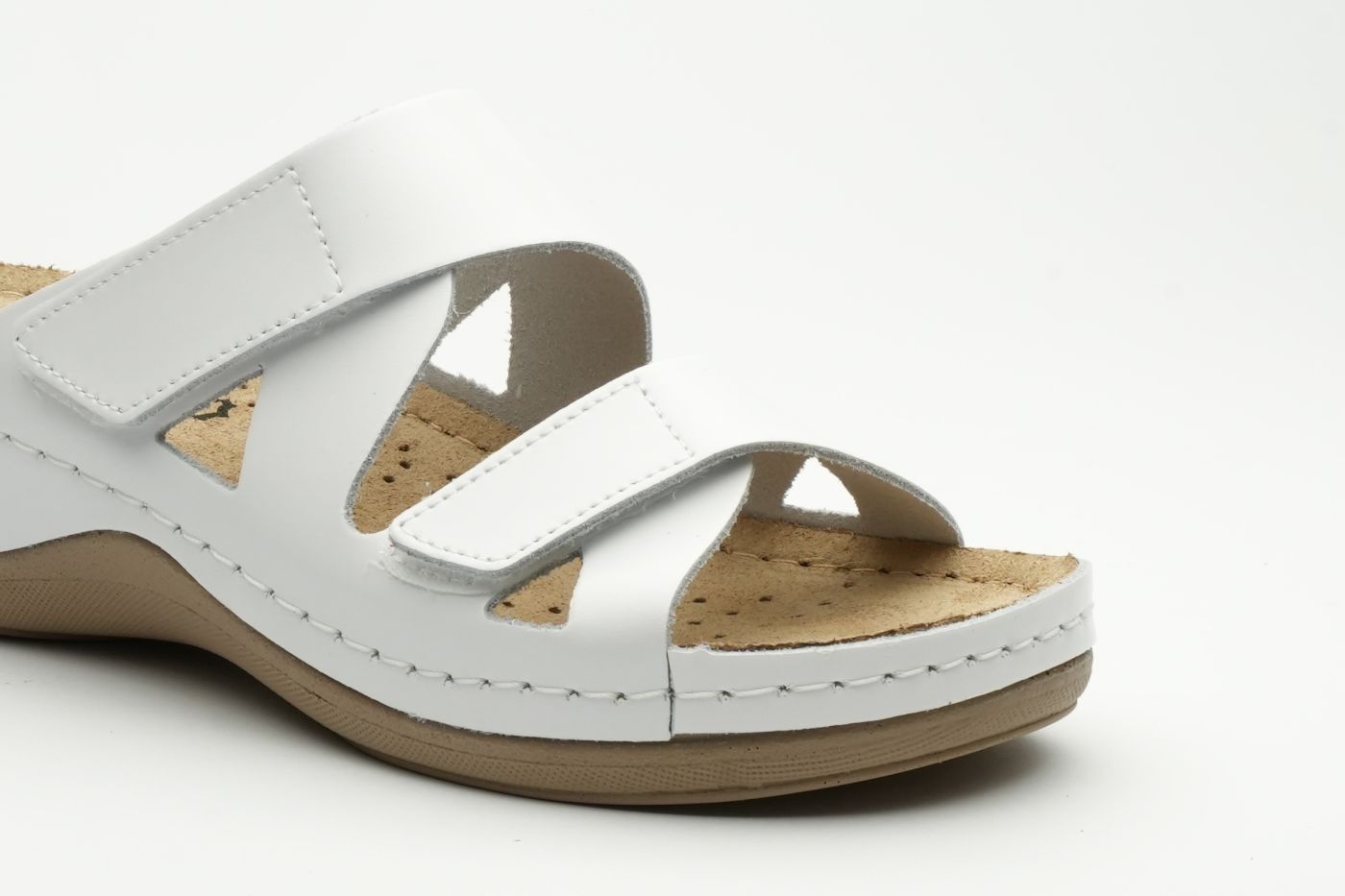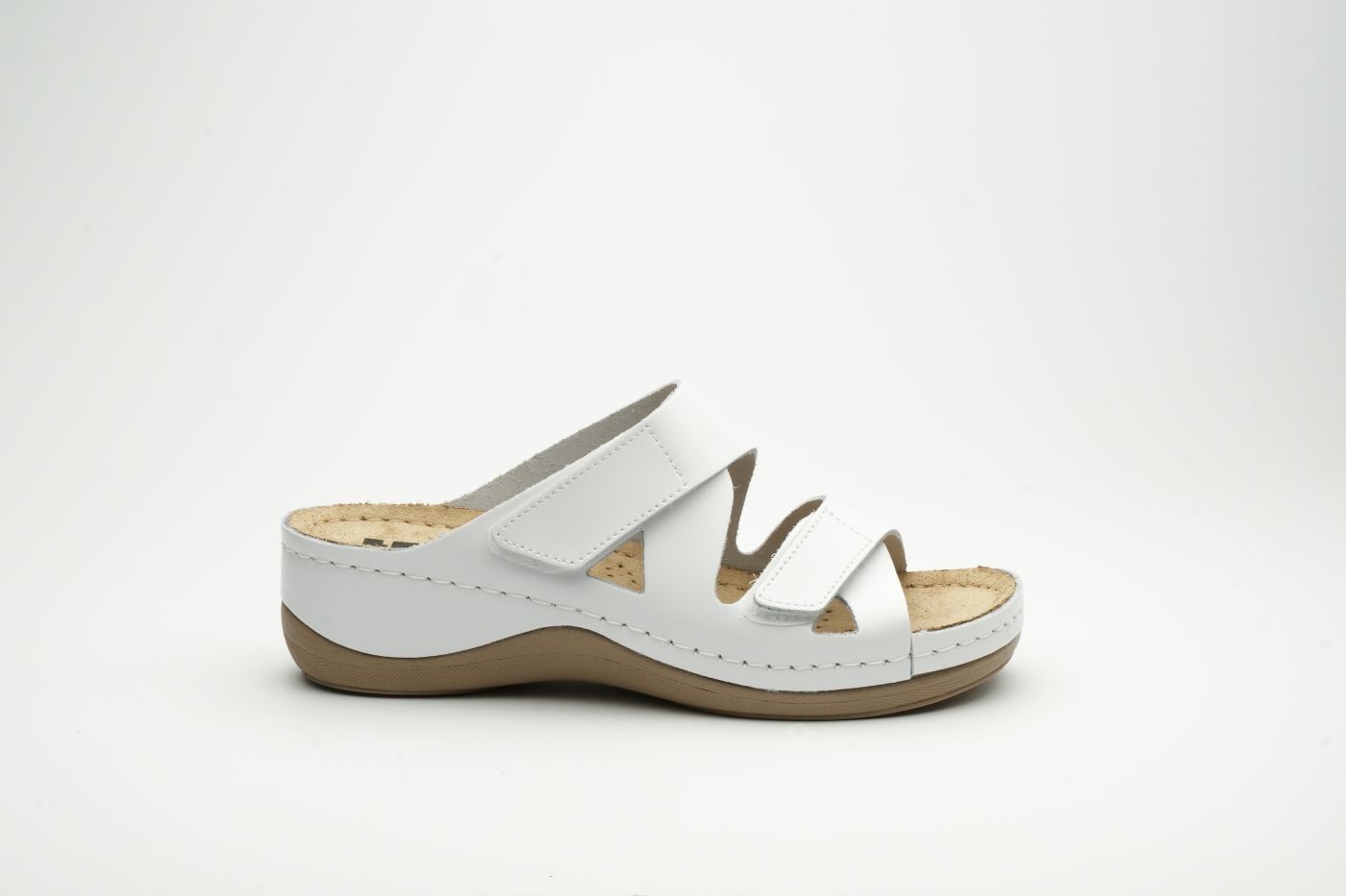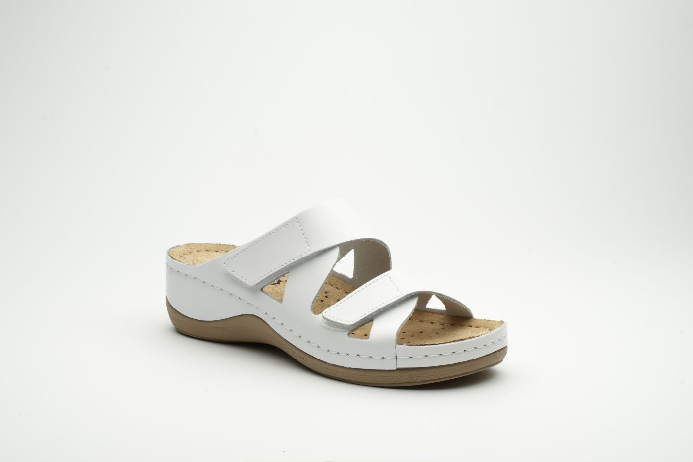 Ženska papuča izrađena od prirodne kože i kožnom tabanicom koja sadrži masažni gel. Đon je naparvljen od poliuretanske mase koji sadrži anti – slip čep koji sprečava klizanje. Gornjište sadrži čičak traku za podešavanje