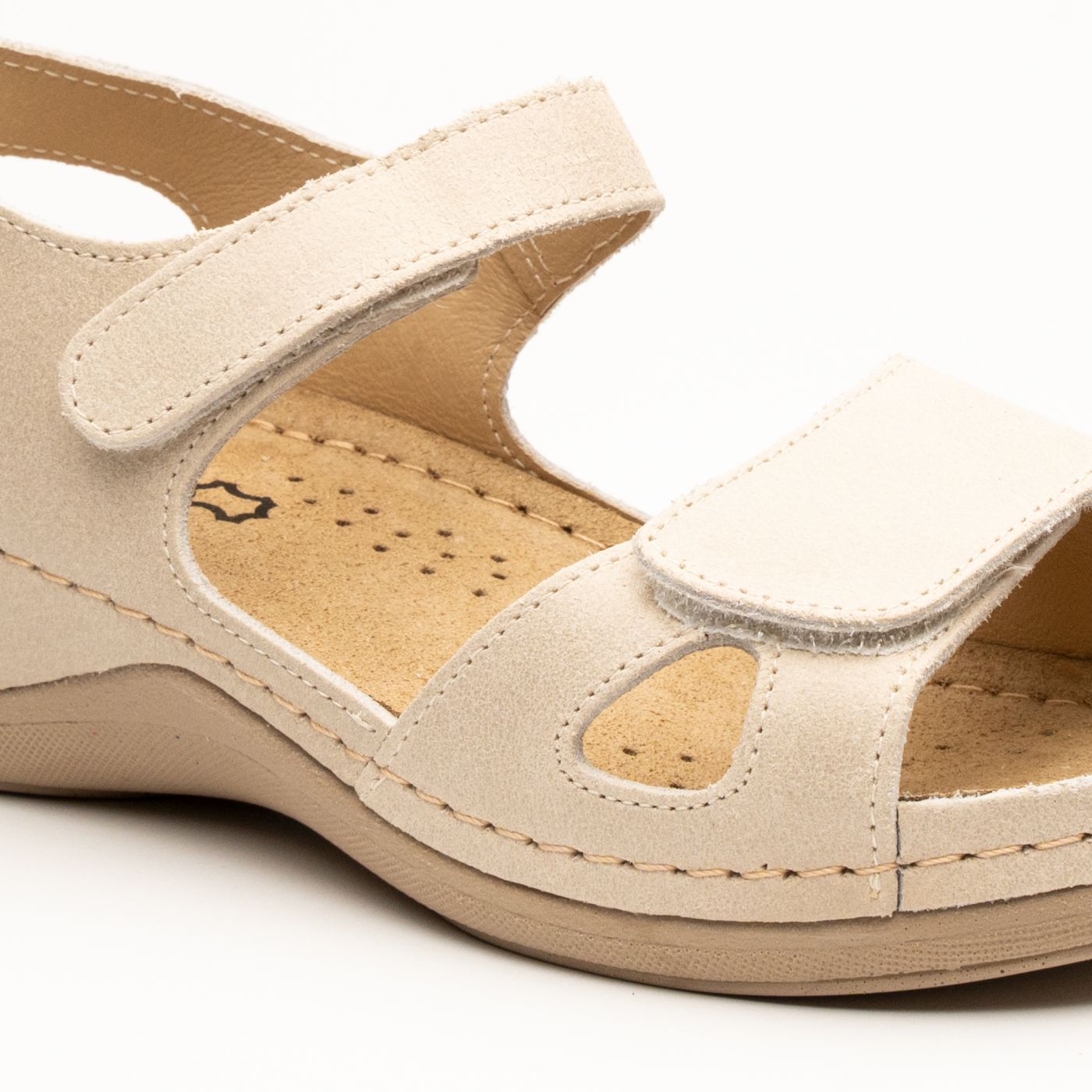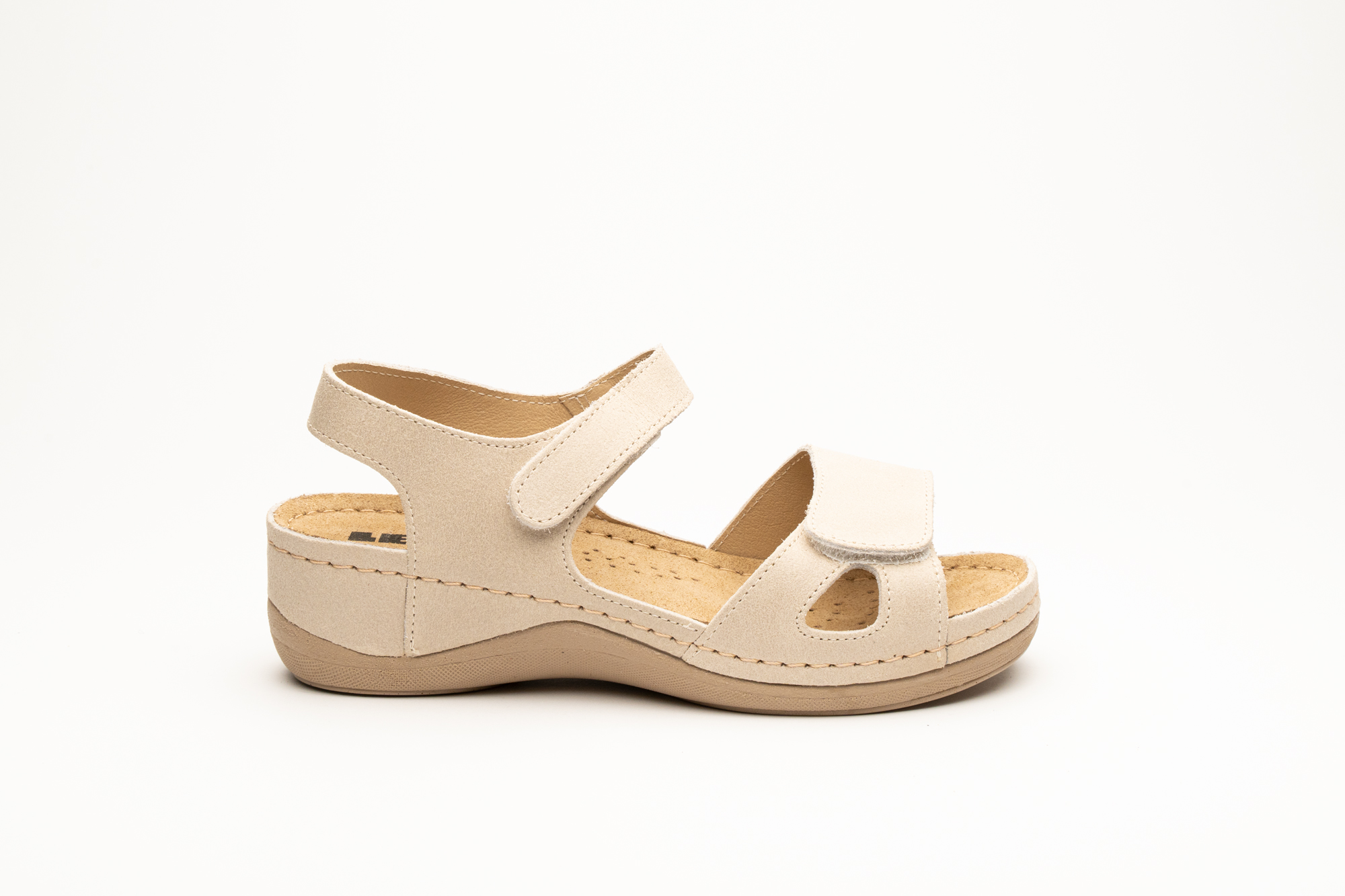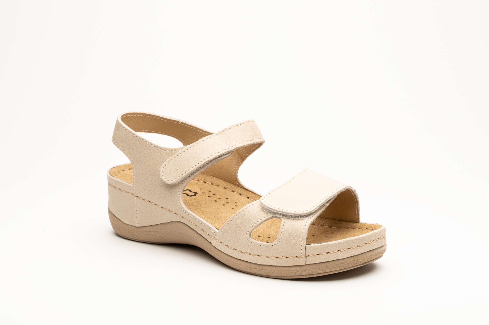 Ženska sandala izrađena od prirodne kože i kožnom tabanicom koja sadrži masažni gel. Đon je naparvljen od poliuretanske mase koji sadrži anti – slip čep koji sprečava klizanje.