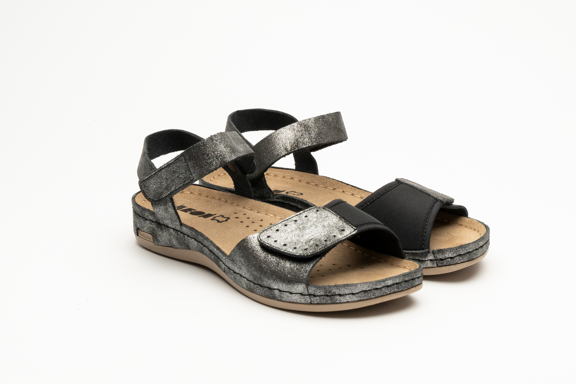 Ženska sandala izrađena od prirodne kože sa elastičnim materijalom koji je pogodan za čukljeve i kožnom tabanicom koja sadrži masažni gel. Đon je naparvljen od poliuretanske mase koji sadrži anti – slip čep koji sprečava klizanje