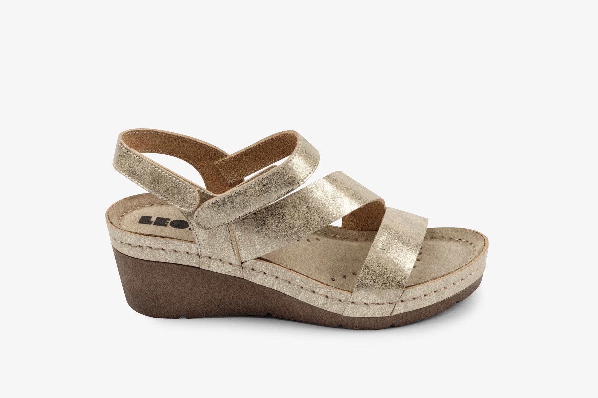 Ženska sandala izrađena od prirodne kože i kožnom tabanicom koja sadrži masažni gel. Đon je naparvljen od poliuretanske mase